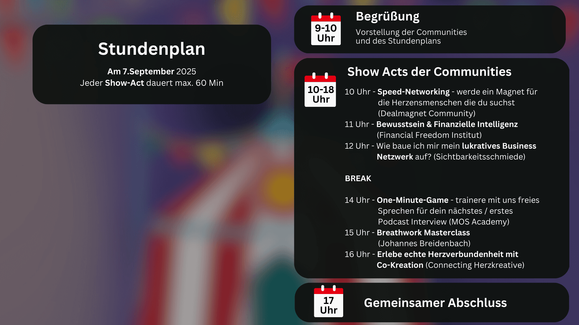 Ablauf - 9:00 Uhr: Gemeinsamer Start & Kurzvorstellung aller Communities - Danach: Du entscheidest frei, in welche Community du hineinschnuppern möchtest - Über den Tag verteilt erwarten dich interaktive Workshops, Impulsvorträge, Speed-Networking, Breathwork-Sessions u. v. m. – jede Community stellt sich auf ihre eigene Art vor - Du kannst flexibel zwischen den Sessions wechseln und so viele Herzensmenschen kennenlernen, wie du magst - 20:00 – 21:00 Uhr: Gemeinsamer Abschluss mit allen Communities Zeitrahmen LIVE von 9:00 – 21:00 Uhr. Den genauen Ablaufplan bekommst du kurz vor dem Event.